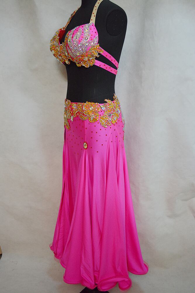 びっしりと施されたキラキラストーンの刺繍、そしてロング紐タイプのアームやおそろいのレッグもついた、華やかなコスチューム。